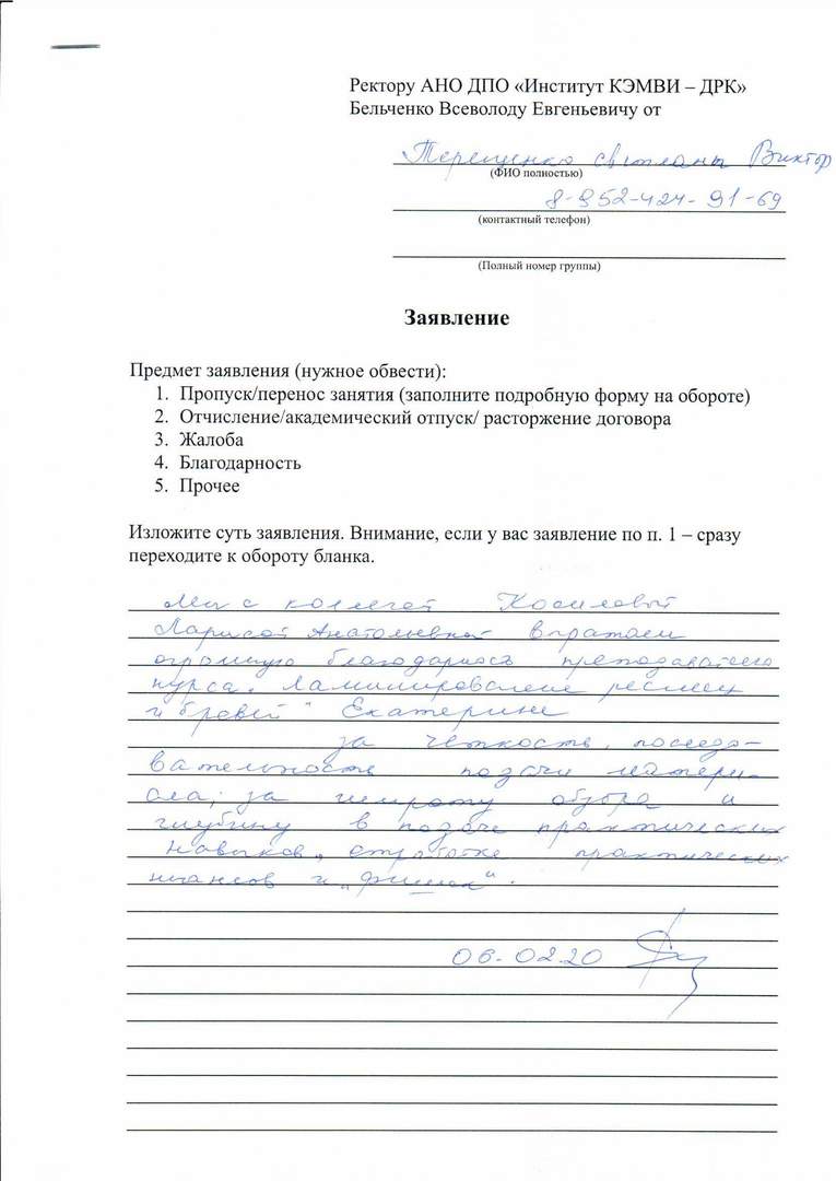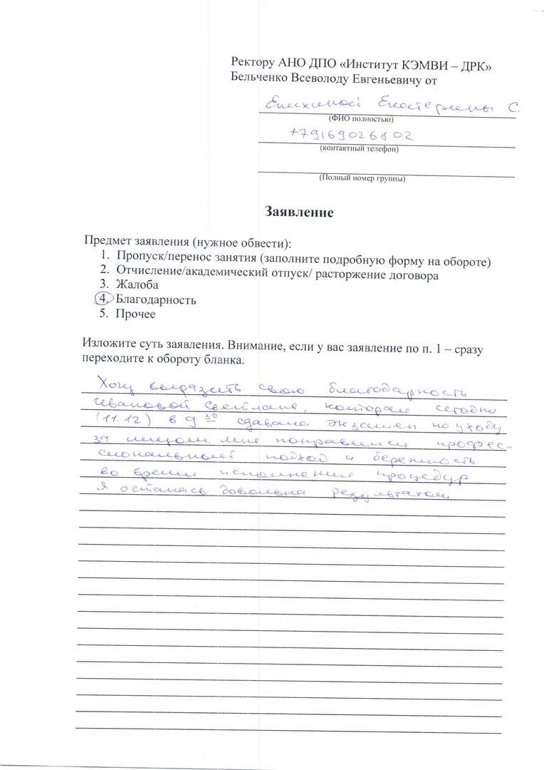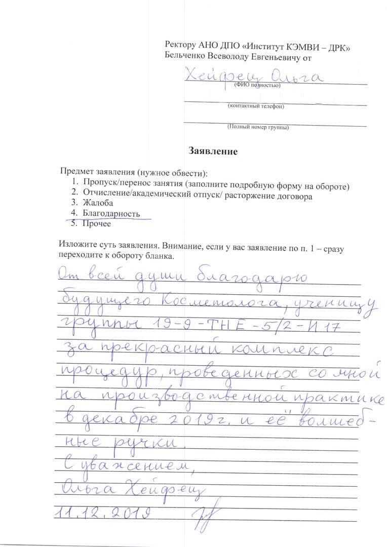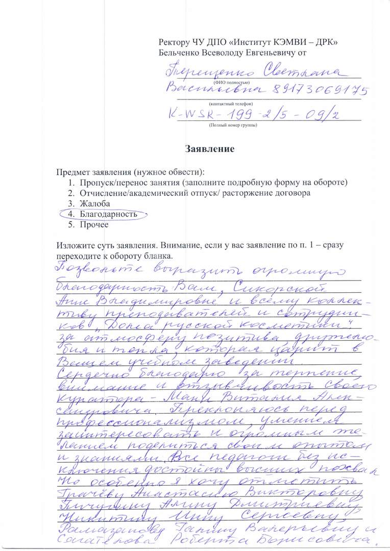 Позвольте выразить огромную благодарность Вам, Сикорской Анне Владимировне и всему коллективу преподавателей и сотрудников "Дома Русской Косметики" за атмосферу позитива, дружелюбия и тепла, которая царит в Вашем учебном заведении. Сердечно благодарю за терпение, внимательность и отзывчивость своего куратора - Манн Виталия Александровича. Преклоняюсь перед професиионализмом, умением заинтересовать и огромным желанием поделиться своим опытом и знаниями. Все педагоги без исключения достойны высших похвал. Но особенно я хочу отметить Грачеву Анастасию Викторовну, Пигулину Алину Дмитриевну, Никитину Инну Сергеевну, Рамазанову Галину Валерьевну, Сагателова Роберта Борисовича.