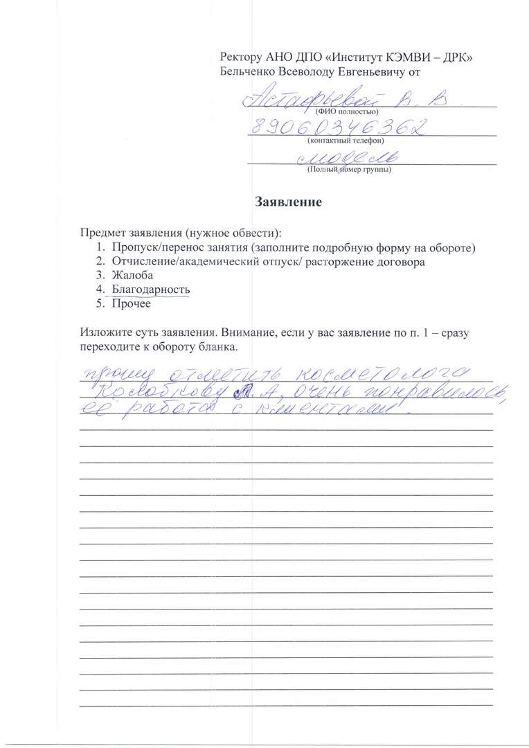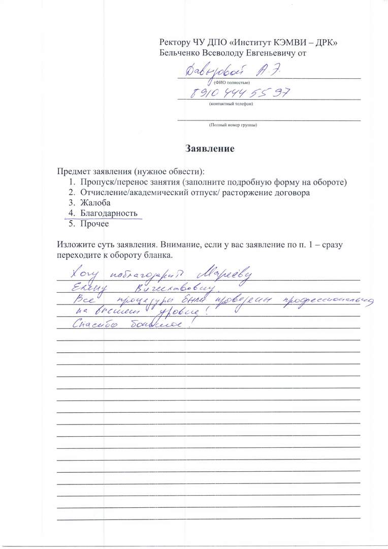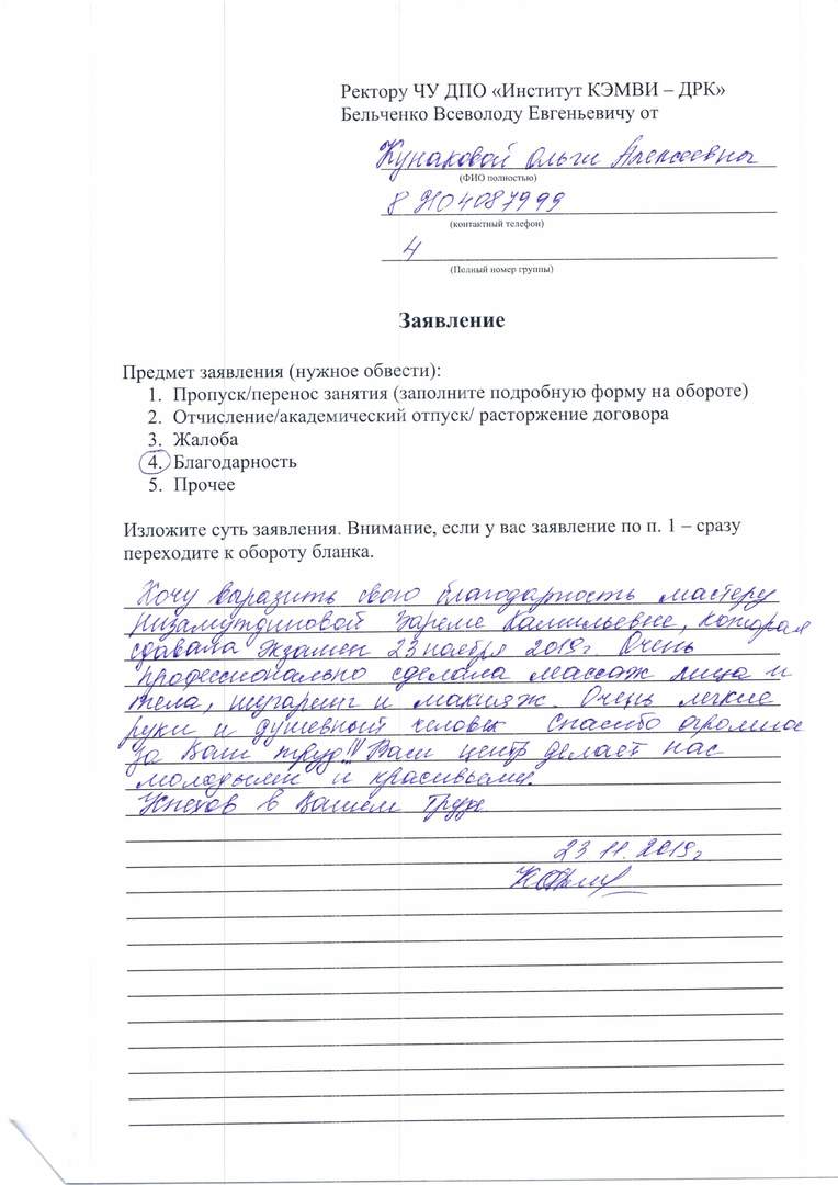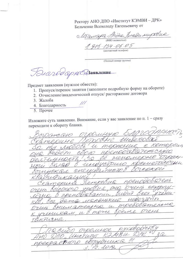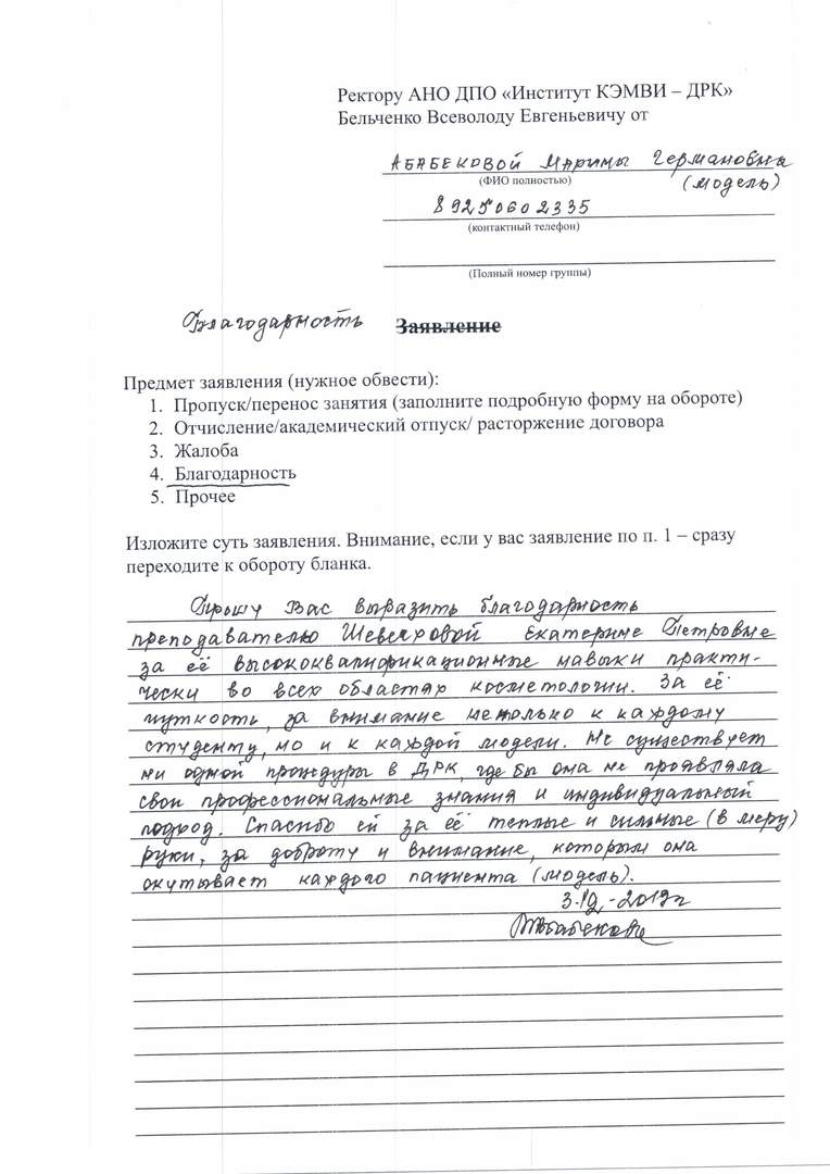 Прошу вас выразить благодарность преподавателю Шевяховой Екатерине Петровне за её высококвалифицированные навыки практически во всех областях косметологии. За её чуткость, внимание не только к каждому студенту, но и к каждой модели. Не существует ни одной процедуры в ДРК, где бы она не оправдала свои знания и индивидуальных подход. Спасибо ей за её теплые и сильные (в меру) руки, за доброту и внимание, которыми она окутывает каждого клиента (модель).