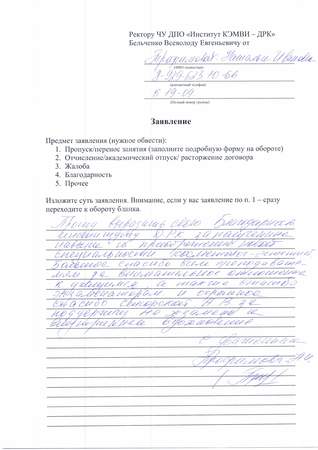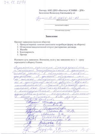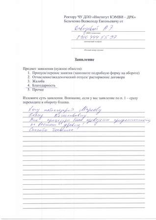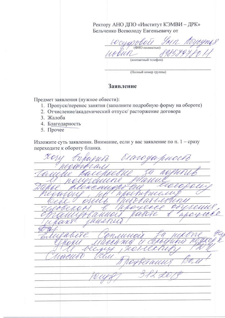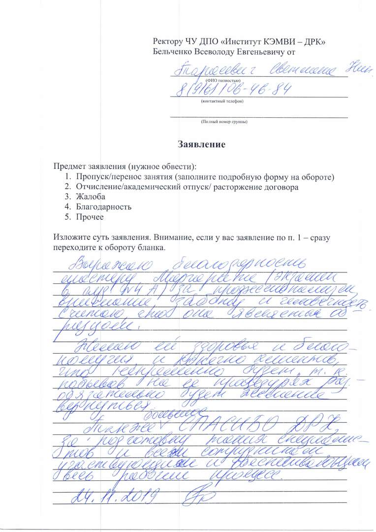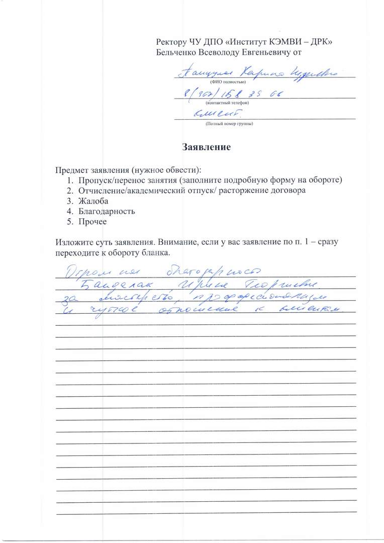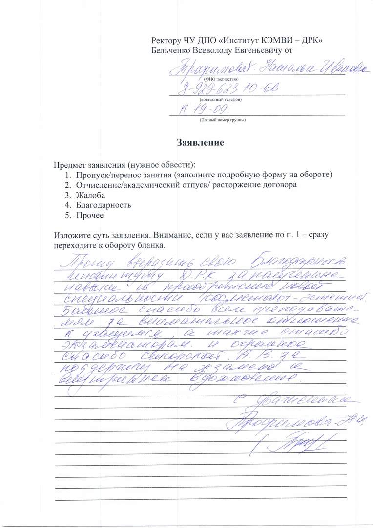 Прошу вас выразить благодарность преподавателю Шевяховой Екатерине Петровне за её высококвалифицированные навыки практически во всех областях косметологии. За её чуткость, внимание не только к каждому студенту, но и к каждой модели. Не существует ни одной процедуры в ДРК, где бы она не оправдала свои знания и индивидуальных подход. Спасибо ей за её теплые и сильные (в меру) руки, за доброту и внимание, которыми она окутывает каждого клиента (модель).