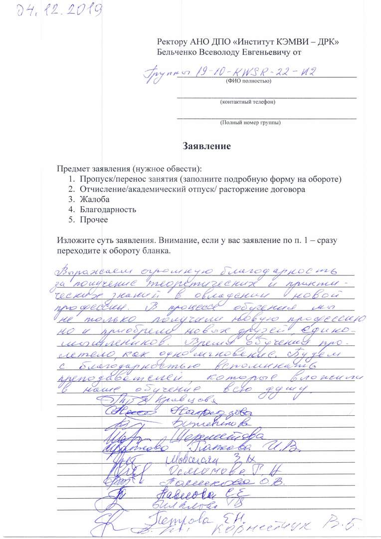 Выражаем огромную благодарность за получение практических и теоретических знаний в овладении новой профессией. В процессе обучения мы не только получили новую профессию, но и приобрели новых друзей, единомышленников. Время обучения пролетело как одно мгновение. Будем с благодарностью вспоминать преподавателей, которые вложили в наше обучение всю душу.