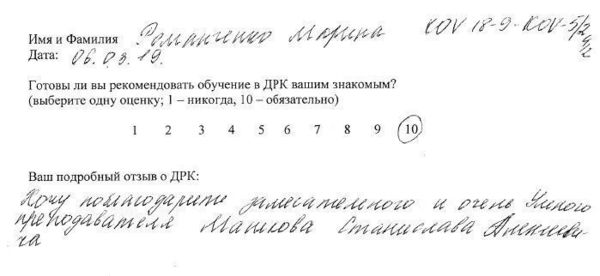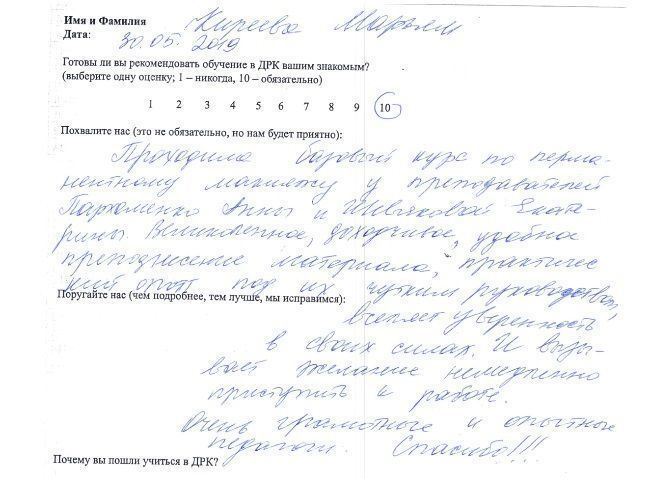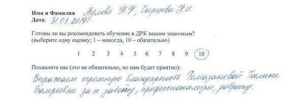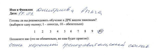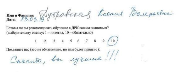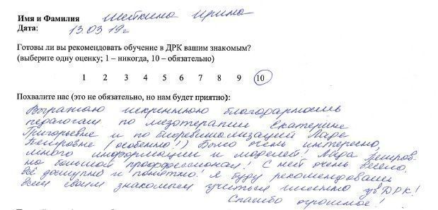 10 баллов Выражаю искреннюю благодарность педагогам по мезотерапии Екатерине Григорьевне и по биоревитализации Ладе Петровне (особенно!). Было очень интересно, много информации и моделей! Лада Петровна большой профессионал! С ней очень весело, всё доступно и понятно! Я буду рекомендовать всем своим знакомым учиться именно в ДРК. Спасибо огромное!