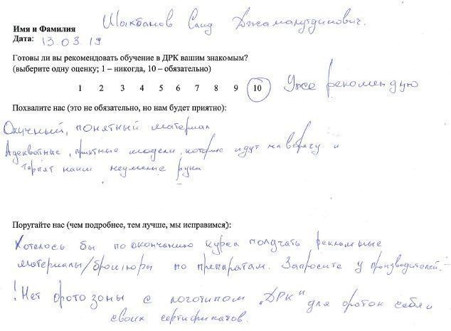 10 баллов Уже рекомендую! Отличный, понятный материал. Адекватные, приятные модели, которые идут навстречу и терпят наши неумелые руки Хотелось бы по окончанию курса получать рекламные материалы/брошюры по препаратам. Запросите у производителей. Нет фотозоны с логотипом "ДРК" для фоток себя и своих сертификатов.