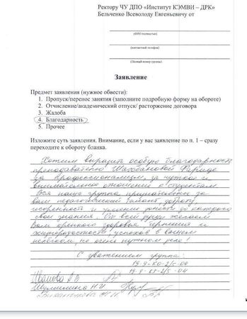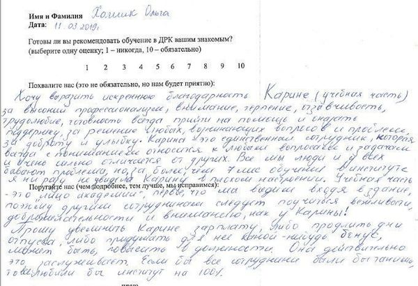 Хочу выразить благодарность Карине (учебная часть) за высокий профессионализм, внимание, терпение, отзывчивость, трудолюбие, готовность всегда прийти на помощь и оказать поддержку, за решение любых возникающих вопросов и проблем, за доброту и улыбку. Карина - это единственный сотрудник, который всегда с пониманием относится к любым вопросам и задачам и очень сильно отличается от других. Все мы люди и у всех бывают свои проблемы, но за более чем 7 месяцев обучения в институте, я ни разу не увидела Карину в плохом настроении. Учебная часть - это "лицо академии", первое, что мы видим входя в здание, поэтому другим сотрудникам следует поучиться вежливости, доброжелательности и вниманию, как у Карины! Прошу увеличить Карине зарплату, либо продлить дни отпуска, либо придумать для неё какой-нибудь бонус, может быть, повысить в должности. Она действительно это заслуживает. Если бы все сотрудники были бы такими, то все любили бы институт на 100%.