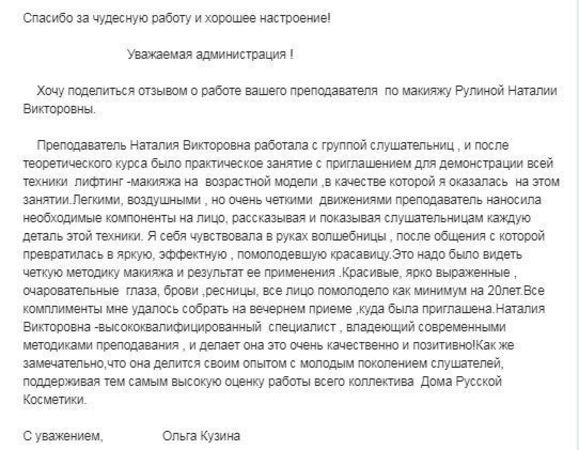 Спасибо за чудесную работу и хорошее настроение! Уважаемая администрация ! Хочу поделиться отзывом о работе вашего преподавателя по макияжу Рулиной Наталии Викторовны. Преподаватель Наталия Викторовна работала с группой слушательниц , и после теоретического курса было практическое занятие с приглашением для демонстрации всей техники лифтинг -макияжа на возрастной модели ,в качестве которой я оказалась на этом занятии.Легкими, воздушными , но очень четкими движениями преподаватель наносила необходимые компоненты на лицо, рассказывая и показывая слушательницам каждую деталь этой техники. Я себя чувствовала в руках волшебницы , после общения с которой превратилась в яркую, эффектную , помолодевшую красавицу.Это надо было видеть четкую методику макияжа и результат ее применения .Красивые, ярко выраженные , очаровательные глаза, брови ,ресницы, все лицо помолодело как минимум на 20лет.Все комплименты мне удалось собрать на вечернем приеме ,куда была приглашена.Наталия Викторовна -высококвалифицированный специалист , владеющий современными методиками преподавания , и делает она это очень качественно и позитивно!Как же замечательно,что она делится своим опытом с молодым поколением слушателей, поддерживая тем самым высокую оценку работы всего коллектива Дома Русской Косметики. С уважением, Ольга Кузина