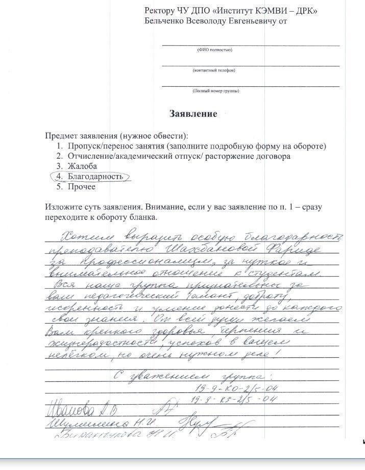 Хотим выразить особую благодарность преподавателю Шахбановой Фариде за профессионализмЮ за чуткое и внимательное отношение к студентам. Вся наша группа признательны за Ваш педагогический талант, доброту, искренность и умение донести до каждого свои знания. От всей души желаем Вам крепкого здоровья, терпения и жизнерадостности, успехов в Вашем нелёгком, но очень нужном деле! С уважением группа: 19-9-КО-2/5-04 19-9-КS-2/5-04