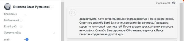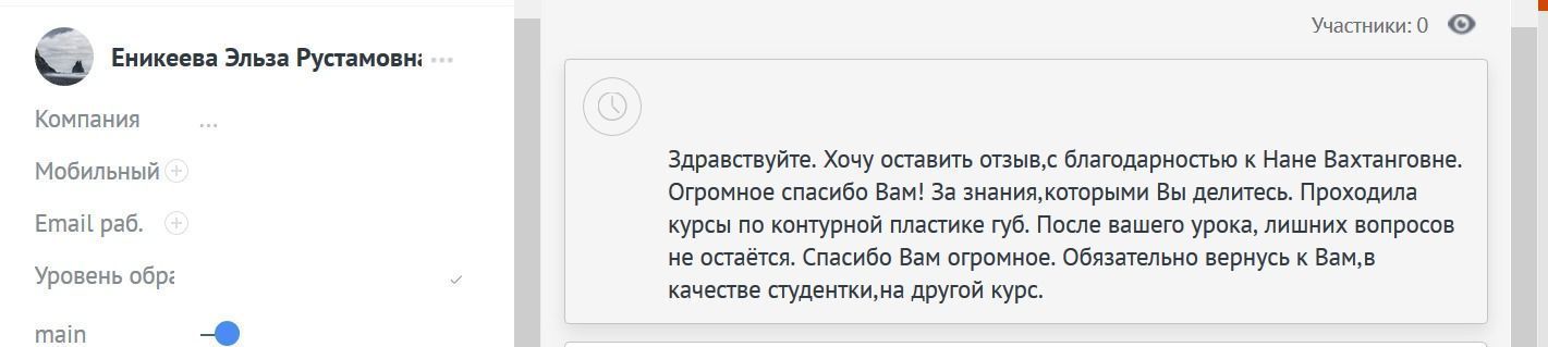 Здравствуйте. Хочу оставить отзыв с благодарностью к Нане Вахтанговне. Огромное спасибо Вам! За знания, которыми Вы делитесь. Проходила курсы по контурной пластике губ. После вашего урока лишних вопросов не остаётся. Спасибо Вам огромное. Обязательно вернусь к Вам в качестве студентки на другой курс.