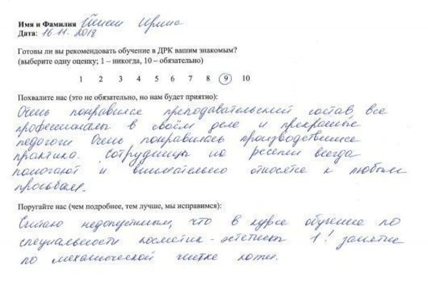 Очень понравился преподавательский состав, все профессионалы в своём деле и прекрасные педагоги. Очень понравилась производственная практика. Сотрудницы на ресепшн всегда помогают и внимательно относятся к любым проблемам.