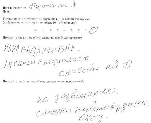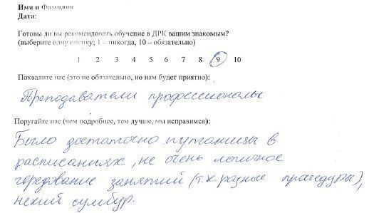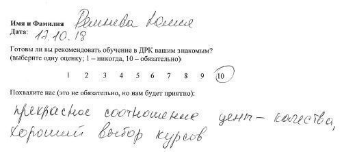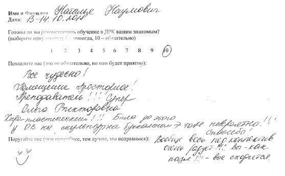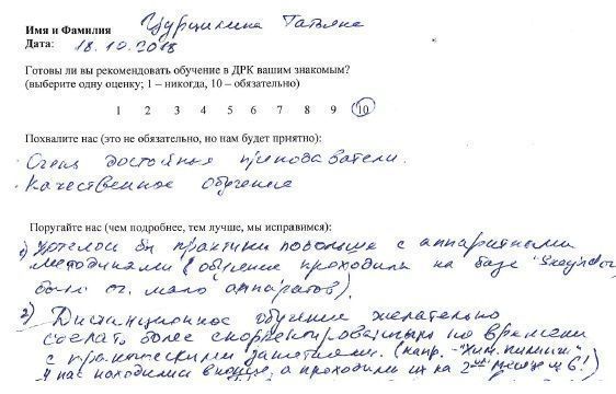 10 баллов Очень достойные преподаватели. Качественное обучение 1) Хотелось бы практики побольше с аппаратными методиками (обучение проходила на базе "Skeyndor, было очень мало аппаратов) 2) Дистанционное обучение желательно сделать более скорректированным по времени с практическими занятиями (напр. - "Хим. пилинги" у нас находились в конце, а проходили их на 2-ом месяце из 6!)