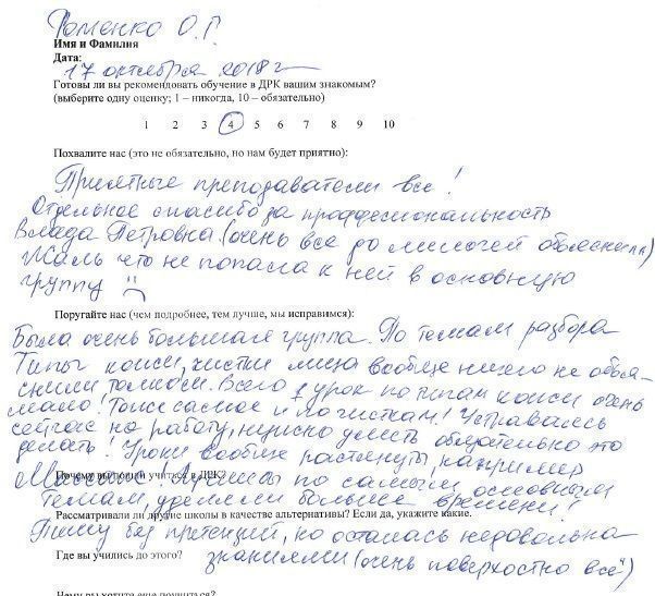 4 балла Приятные преподаватели все! Отдельное спасибо за профессиональность, Лада Петровна (очень всё до мелочей объяснила). Жаль, что не попала к ней в основную группу. Была очень большая группа. По темам разбора "Типы кожи", "Чистки лица" вообще ничего не объяснили толком. Всего 1 урок по типам очень мало! То же самое и по чисткам! Устраиваясь сейчас на работу, нужно уметь обязательно это делать! Уроки вообще растянуты, например, массаж! Лучше бы по самым основным темам уделяли больше времени! Пишу буз претензий, но осталась недовольна занятиями (очень поверхностно всё)