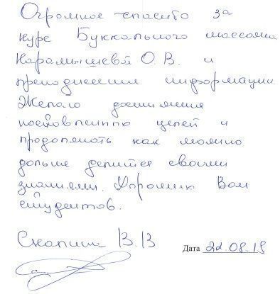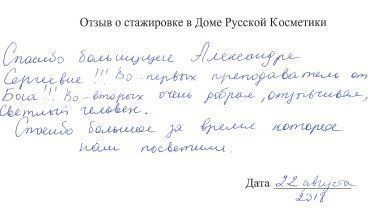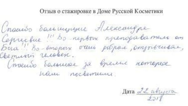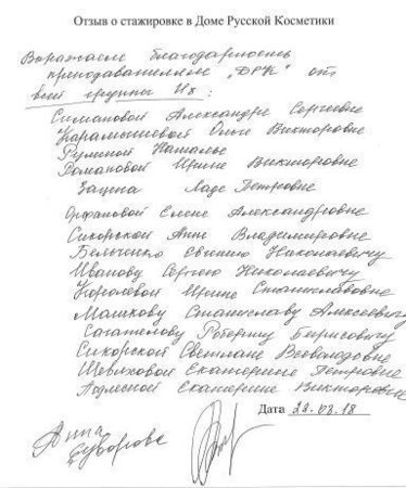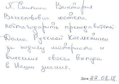 Я, Скалина Виктория Вячеславовна хотела поблагодарить преподавателей Дома Русской Косметики за подачу материала и внесение своего вклада в наши занния