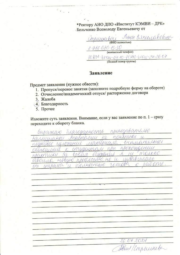 Выражаю благодарность преподавателю Валлиулиной Анастасии за понятное и подробное изложение материала, внимательное отношение к студентам при прохождении практики. Зав время обучения я не только освоила новую профессию, но и избавилась от страха и полностью готова к работе.