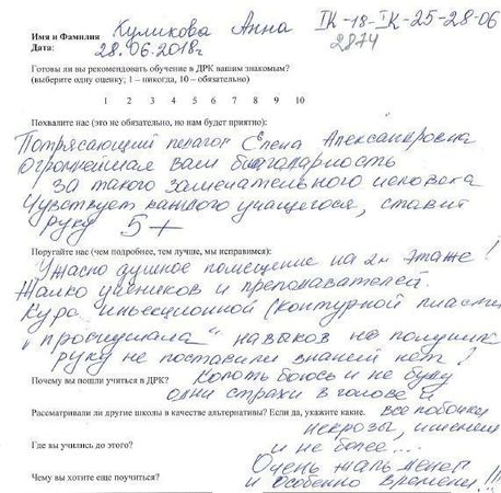 Потрясающий педагог Елена Александровна. Огромнейшая Вам благодарность за такого замечательного человека. Чувствует каждого учащегося, ставит руку 5+. Ужасно душное помещение на 2-м этаже. Жалко учеников и преподавателей. Курс инъекционной (контурной пластики) "прослушала", навыков не получила, руку не поставили, знаний нет! Колоть боюсь и не буду. Одни страхи в голове и все побочки: некрозы, ишемия, не более. Очень жаль денег и особенно времени!!!