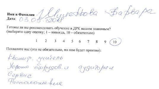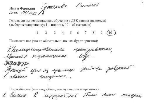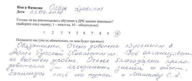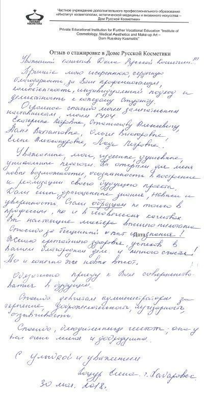 Уважаемый коллектив Дома Русской Косметики!!! Примите мою искреннюю сердечную благодарность за ваш профессионализм, компетентность, индивидуальный подход и деликатность к каждому студенту. Огромное спасибо моим замечательным наставникам, моим гуру: Екатерине Петровне, Станиславу Алексеевичу, Нане Вахтанговне, Ольге Викторовне, Елене Александровне, Ладе Петровне! Уважаемые мои, чудесные, душевные, уникальные педагоги. Вы открыли для меня новые возможности, осознанность в построении и реализации своего будущего проекта. Дали сил, драгоценные знания, навыки и уверенность. Стали образцом не только в профессии, но и в человеческих качествах. Вы настоящие мастера высшего пилотажа. Спасибо за бесценный опыт и знания! Желаю крепчайшего здоровья, успехов в вашем благородном деле и личного счастья! Но и, конечно же, новых высот. Обязательно приеду к вам совершенствоваться в будущем. Спасибо девчатам администраторам за терпение, доброжелательность, лучезарность, отзывчивость. Спасибо блюстительнице чистоты, она у вас очень мила и добродушна. С улыбкой и уважением, Коцур Елена. г. Хабаровск 30 мая 2018 г.