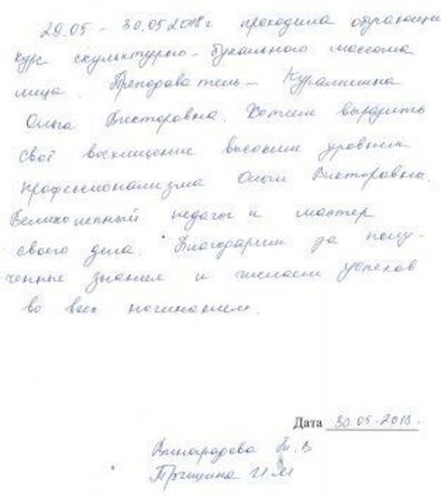 29.05-30.05.2018г проходила обучающий курс скульптурно-буккального массажа лица. Преподаватель - Карамышева Ольга Викторовна. Хотим выразить своё восхищение высоким уровнем профессионализма Ольги Викторовны. Великолепный педагог и мастер своего дела. Благодарим за полученные знания и желаем успехов во всех начинаниях.