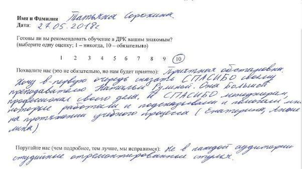 Приятная обстановка. Хочу в первую очередь сказать спасибо своему преподавателю Наталье Рулиной. Она большой профессионал своего дела. Спасибо менеджерам, которые работали и подсказывали, и помогали мне на протяжении учебного процесса (Екатерина, Анжелика).