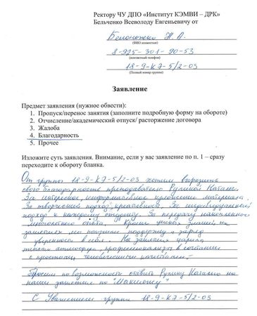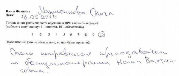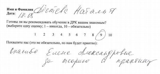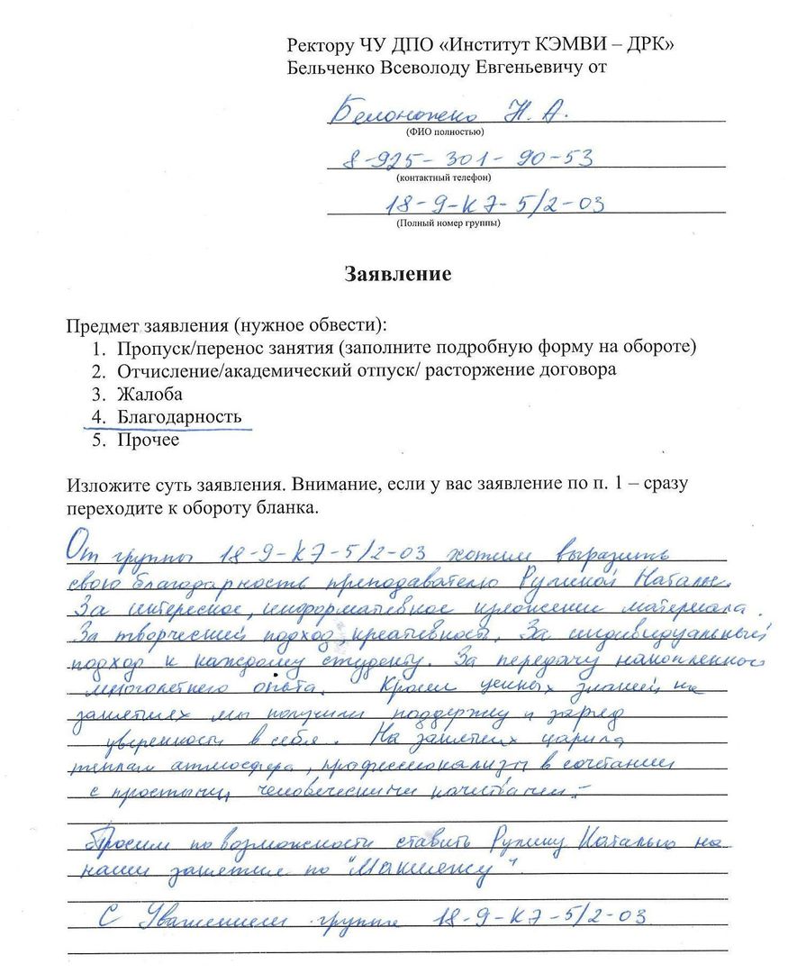 От группы 18-9-КЭ-5/2-03 хотим выразить свою благодарность преподавателю Рулиной Наталье за интересное , информативное изложение материала. За творческий подход, креативность. За индивидуальный подход к каждому студенту. За передачу накопленного многолетнего опыта. Кроме ценных знаний на занятиях мы получили поддержку и заряд уверенности в себе. На занятиях царила теплая атмосфера, профессионализм в сочетании простыми человеческими качествами.