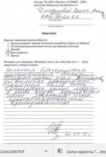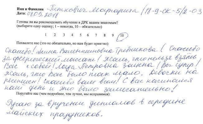10 баллов Спасибо! Алина Валентиновна Требникова! Спасибо за феерический массаж! Жаль, что нельзя взять Вас с собой! Лада Петровна Зацепа! Вы супер! Жаль, что Вас было так мало. Девочки на ресепшн! Спасибо вам всем! С вас начинался наш день и это было замечательно! Ругаю за вручение дипломов в середине майских праздников.