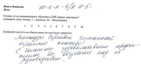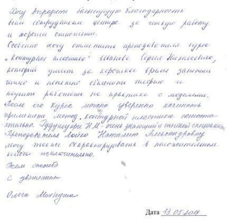 Хочу выразить большую благодарность всем сотрудникам центра за четкую работу и хорошее отношение. Особенно хочу отметить преподавателя курса "Контурная пластика" Иванова Сергея Николаевича, который умеет за короткое время занятий четко и понятно объяснить теорию и научить работать на практике с моделями. После его курса можно уверенно начинать применять метод контурной пластики самостоятельно. Гудушаури Н.М (?) - очень знающий и опытный специалист. Преподавателя Лойко Наталию Александровну могу также охарактеризовать в положительном ключе исключительно. Всем спасибо! С уважением, Ольга